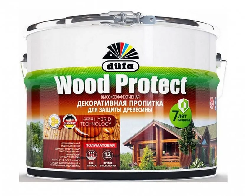 - пропитка «Wood Protect» для наружных и внутренних работ. Состав основан на алкидном лаке, который формирует водоотталкивающую пленку. В результате поверхность отлично переносит перепады атмосферы;