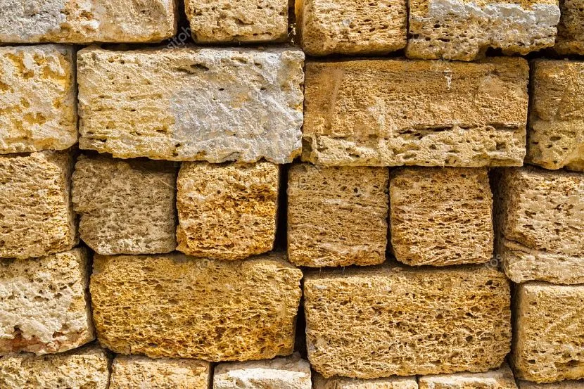 - М15. Содержит большие поры, внешне довольно рыхлый, бывает различных оттенков, но зачастую желтый. Из-за последнего его иногда называют «желтяком». Желтоватый окрас придают песчаные добавки, обладающие большей тепловой проводимостью, чем ракушечный известняк. Этот стройматериал считается самым холодным. Если подобный блок ударить о твердое основание, он моментально распадется на части. Средний вес М15 сравнительно небольшой (около 11 кг). В процессе погрузочно-разгрузочных работ наружный слой элементов нередко повреждается. Чтобы полностью избавиться от образовавшихся дефектов, поврежденные поверхности требуется оштукатурить. Такие изделия с успехом применяются при строительстве банных помещений, гаражей, нежилых сооружений, декоративных заборов.