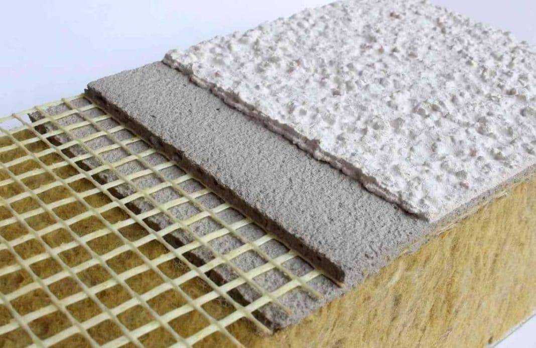Слой теплоизоляции в фасадных системах производится из экструдированного или обычного пенополистирола, а также из ламинированной или обычной минеральной ваты. Оба вида материала поставляются плитами. Изготавливается минеральная вата из стекла, соды, известняка и песка. Её структура представлена стекловидными тонкими волокнами. Положительно отличается высокими показателями проницаемости пара.