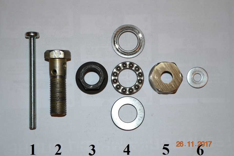 1 — рабочий винт (5руб) — сменные винты, по диаметру резьбовой заклёпки. Приобрел резьбой М5, М6 и М8, класс прочности 8.8. В итоговом виде длина рабочего винта = 70мм.2 — корпус (50руб) (что-то типа того. Это основная часть заклёпочника. Многие берут обычные болты и сверлят насквозь в нём отверстие Ø8. Есть более простое решение — топливный болт КАМАЗ 870022 М14. В нём уже почти всё сделано, нужно лишь досверлить отверстие в головке болта3 — упорная гайка (20руб). Использовать «сырые» гайки из магазинов типа Леруа не стал, подобрал нормальную калёную колёсную гайку PE AUTOMOTIVE 01710900A М14 от грузовиков.4 — опорный подшипник. Необходим для того, чтобы исключить стягивание «винтом» резьбовой заклёпки. Идеально подошел копеечный подшипник с площадки AliExpress (ищется по словам thrust bearing). Внешний диаметр идеально подошел под гайку, внутренний — под резьбу М14 топливного болта. Изначально использовал опорные подшипники передник стоек, но с ними конструкция получалась намного габаритнее.5 — переходник(25руб). Вот тут как ни старался, не искал именно автомобильный компонент, но так и не придумал более элегантного решения чем использовать Переходник внутренняя-наружная резьба, 1/2″х3/8″. Внешний диаметр так же совпал с диаметром подшипника. Для экономии общей длины инструмента (около 10мм), я срезал часть с наружной резьбой.6 — шайба, ставится в соответствии с размером резьбы рабочего винта. Нужно для центровки снизу рабочего винта в теле корпуса, чтобы заклёпка вытягивалась без перекоса.
