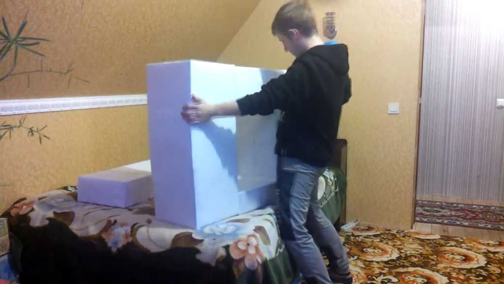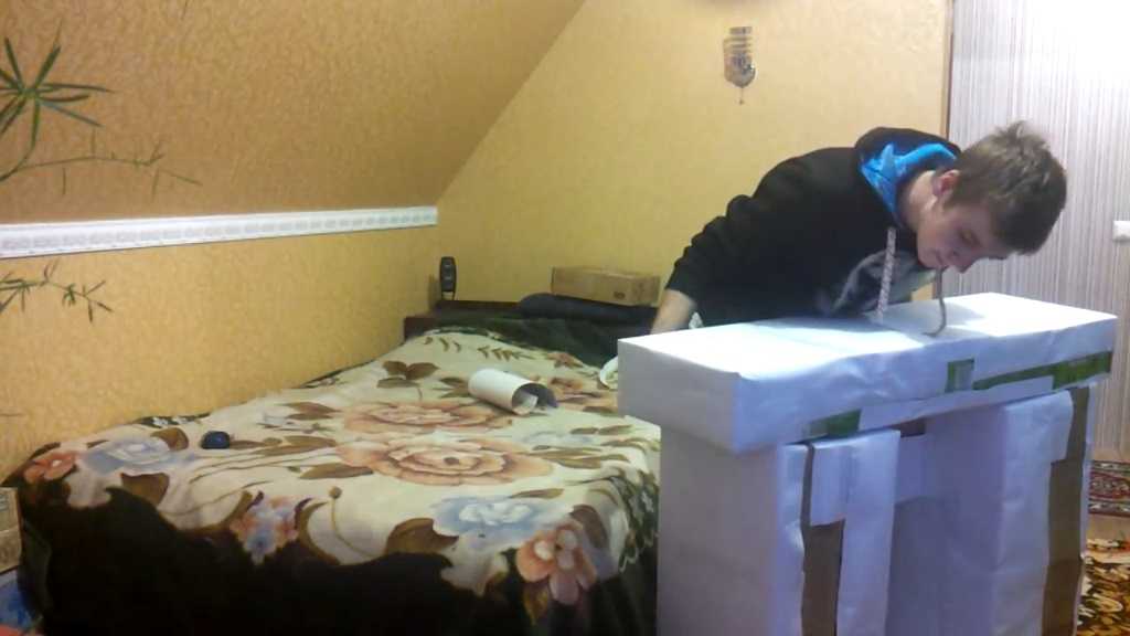 Самая простая в изготовлении конструкция получается из коробки от телевизора с большой диагональю. Маленькие коробочки, к примеру от мелкой бытовой техники или из-под обуви, нужно будет склеивать и переделывать по размеру.