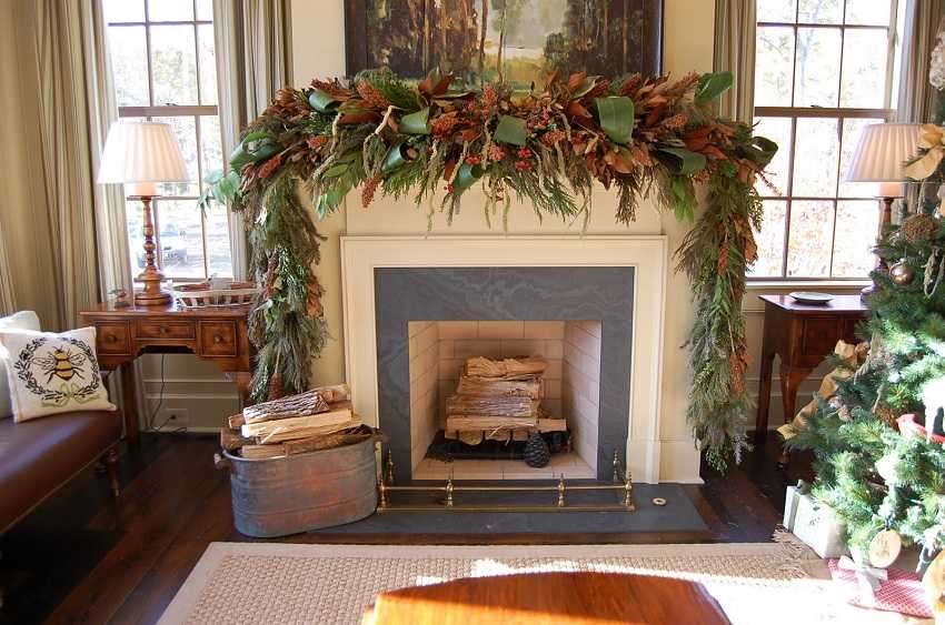 Для украшения рождественского очага используют различные игрушки и природные материалы, например: