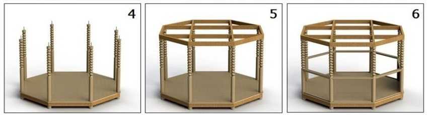 Для завершённого и гармоничного внешнего вида оформление желательно дополнить фризами, сделанными в едином стиле с перилами. Чтобы беседка служила долго и не теряла привлекательного вида, все деревянные части следует обработать антисептиком, а затем покрыть несколькими слоями морилки.