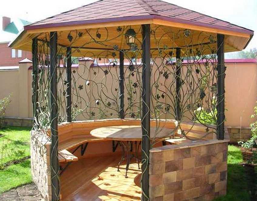 Кованые беседки смотрятся очень красиво. В данном случае лучше всего приобрести готовую конструкцию и просто собрать ее. Обычно беседки из кованых элементов стоят довольно дорого.