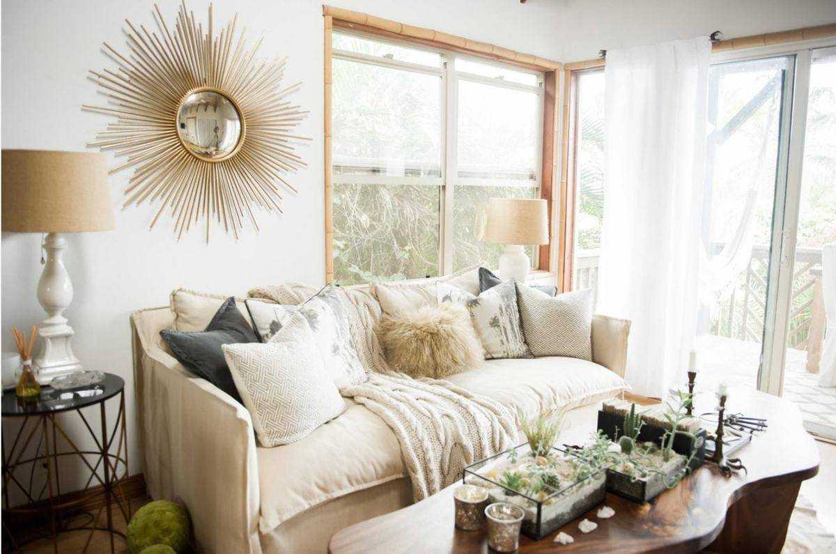 Бежевая мебель в интерьере современной гостиной светлых оттенков