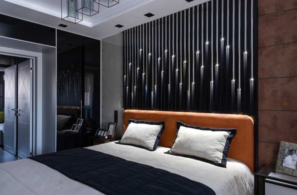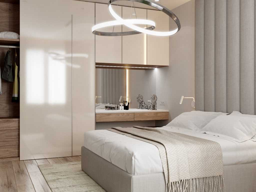 Постельное белье должно быть шелковым либо хлопковым, без заметных принтов. Точечное светодиодное освещение по периметру и прикроватные бра с матовыми молочно-белыми плафонами помогут создать спокойную атмосферу и настроиться на безмятежный сон.