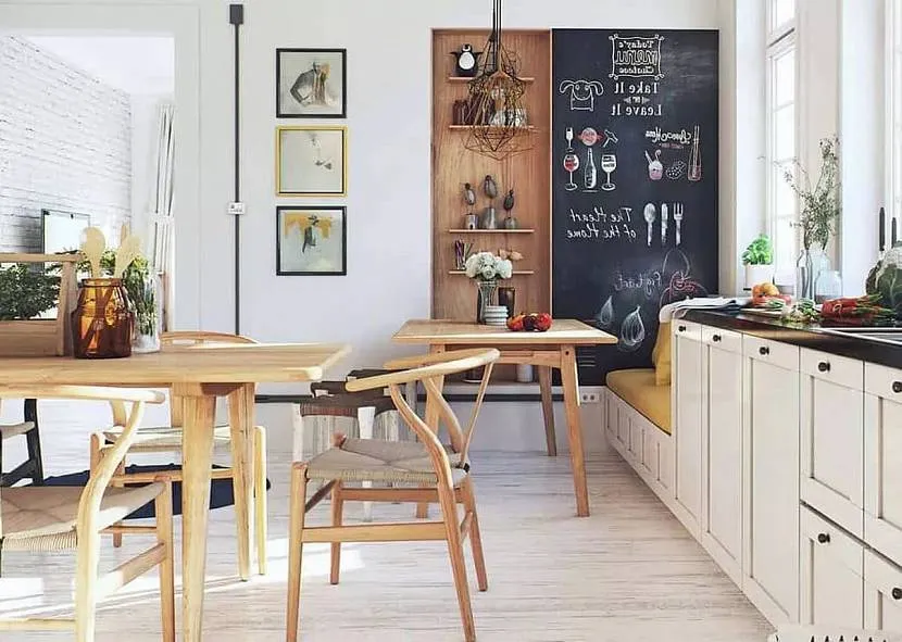 Уютную атмосферу на кухне создают отдельные детали. На стену монтируют грифельную доску с мелком. Крупы пересыпают в прозрачные банки с красивыми крышками и расставляют по полкам. Оживят интерьер живые растения не только на подоконнике, но и на столешницах. В рабочей зоне ставят маленькие горшки с травой, в столовой – кашпо с цветами.