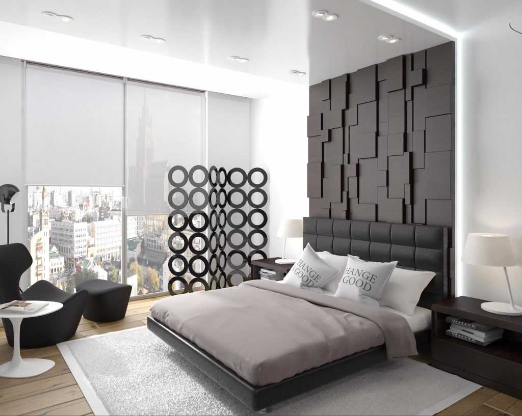 Варианты оформления спальни в черно-белых тонах создадут гармонию, настроят на спокойный лад. Так же подойдут тёмные шторы и покрывала.