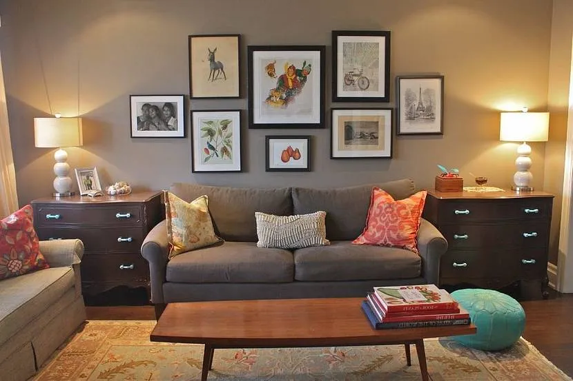 Если не знаете, как создать уют в доме, советуем поменять картины. В интерьере необычно воспринимается дизайн с одинаковыми лаконичными рамами или решения без багетов. Оживить обстановку поможет асимметричное размещение полотен и установка элементов разных размеров.
