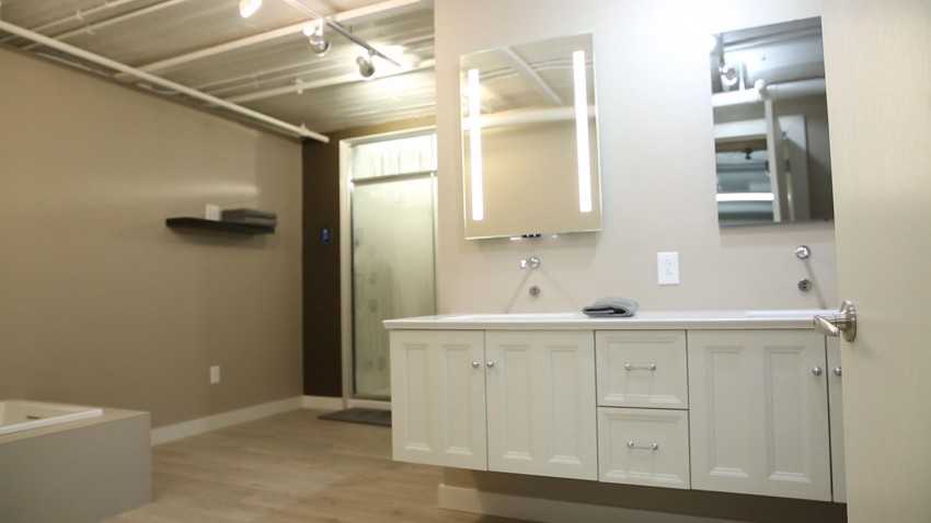 Здесь есть где разгуляться дизайнерской фантазии. Новинки дизайна просторного туалета – массивная раковина, несколько зеркал, удобные шкафчики и места для хранения с ящичками и выдвижными секциями.