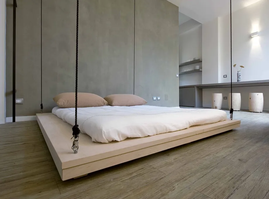 Крепление на канатах создает эффект легкой, парящей конструкции. Это благоприятно сказывается на общем впечатлении от комнаты: она кажется более просторной. Монтаж подвесной кровати должен основываться на точном расчете нагрузок; также необходимо убедиться в надежности потолка и крепежных элементов.