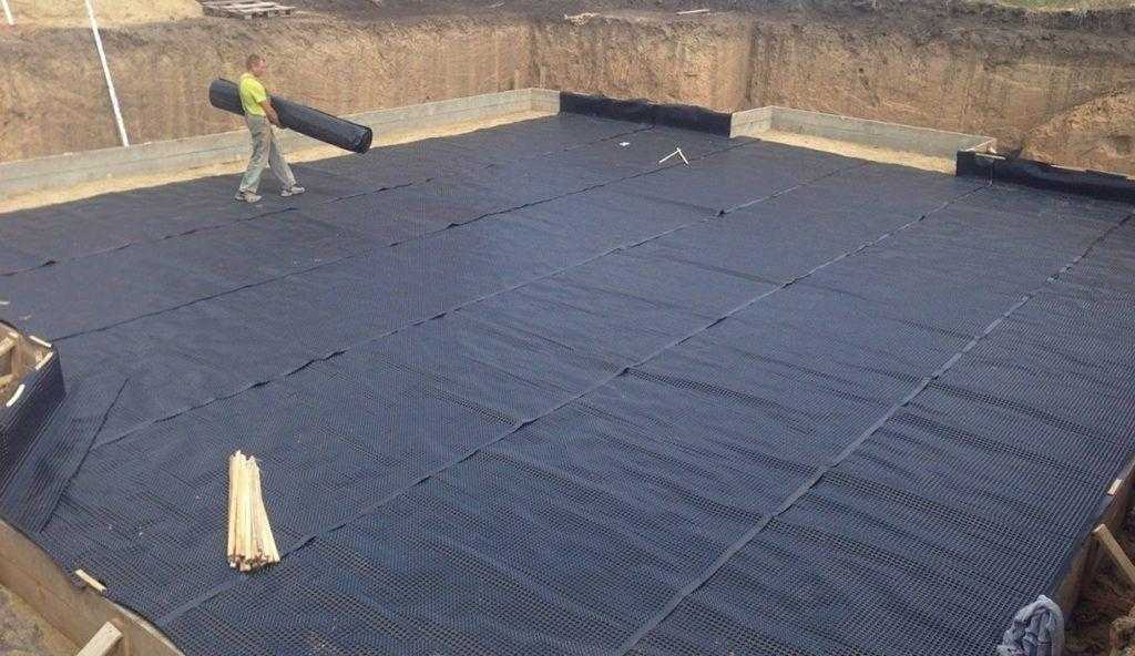 Ее обычно применяют, чтобы защитить нижнюю горизонтальную плоскость фундамента. Гидроизоляционный материал укладывают под плиту с нахлестом, проклеивая или сваривая швы.