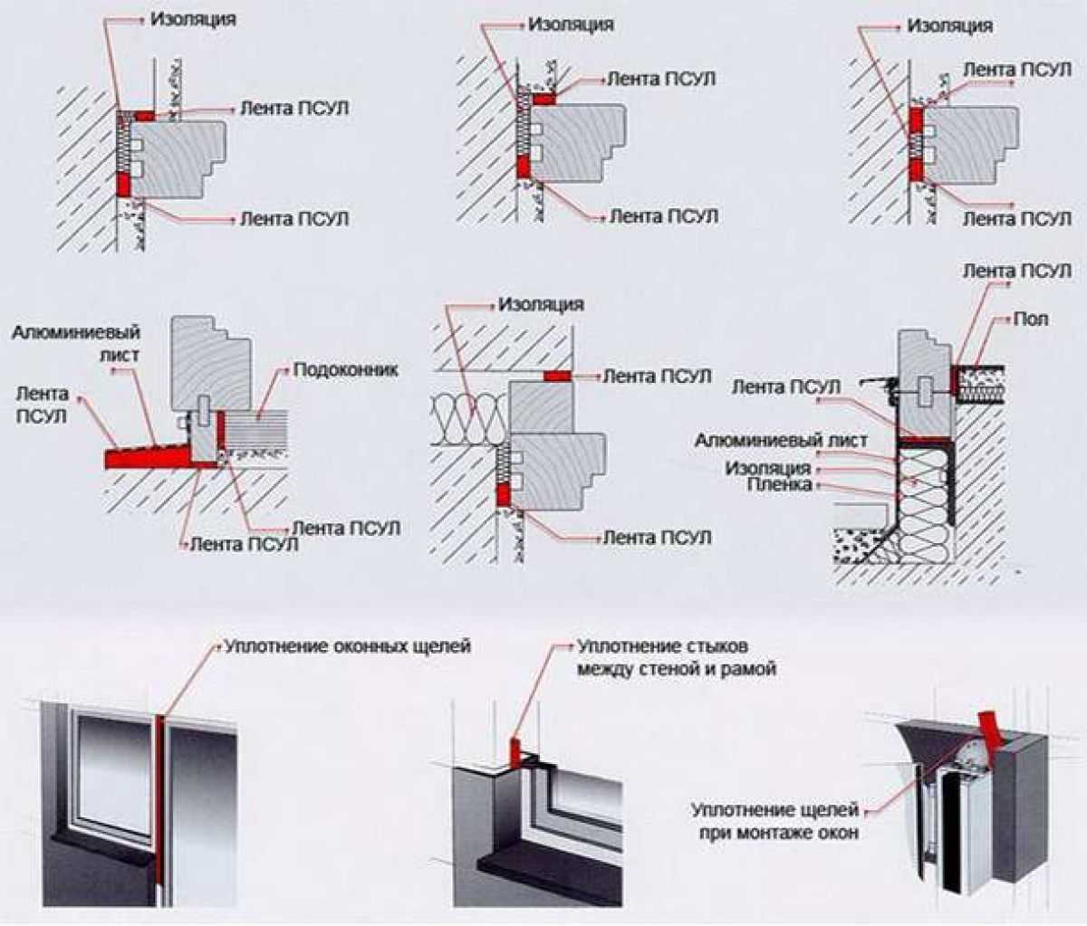 - ПСУЛ, или предварительно сжатая уплотнительная лента – применяется для отделки и пароизоляции наружных стыков, обеспечивает плотное соединение оконной рамы с наружной стеной. материал основы – бутилкаучук, толщина и эластичность лент дает хорошую изоляцию.