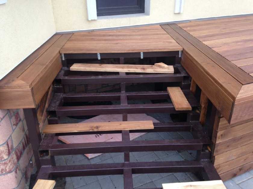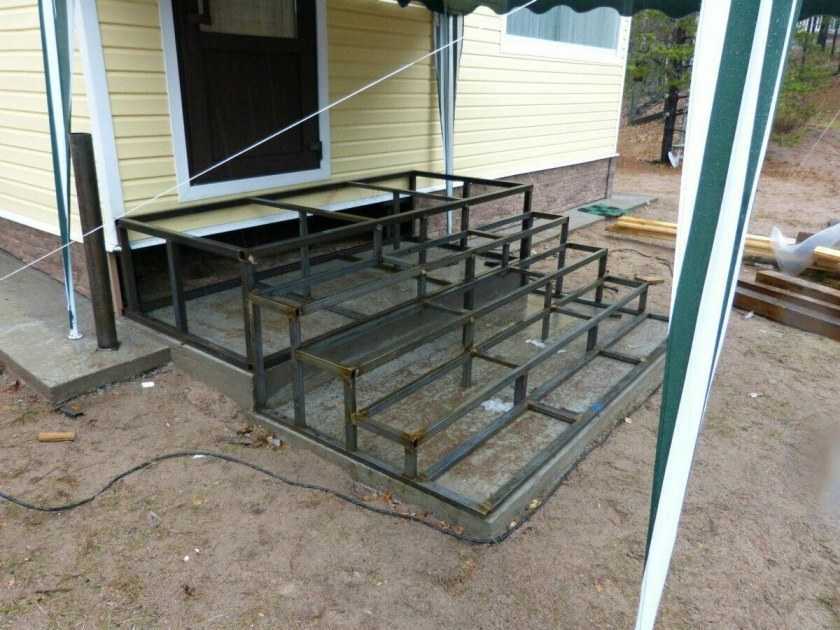 Этот же принцип может использоваться и при конструировании крыльца из металла. Направляющие могут быть изготовлены из железа, а ступени приварены в треугольные выемки или к самим направляющим.
