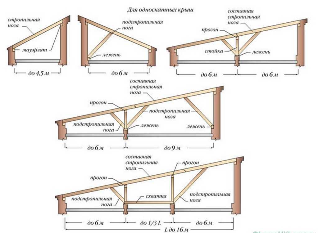 Как уже говорилось, для односкатной крыши, в зависимости от характера несущих стен и пролета, можно выбрать разные типы стропил и узлы их крепления.