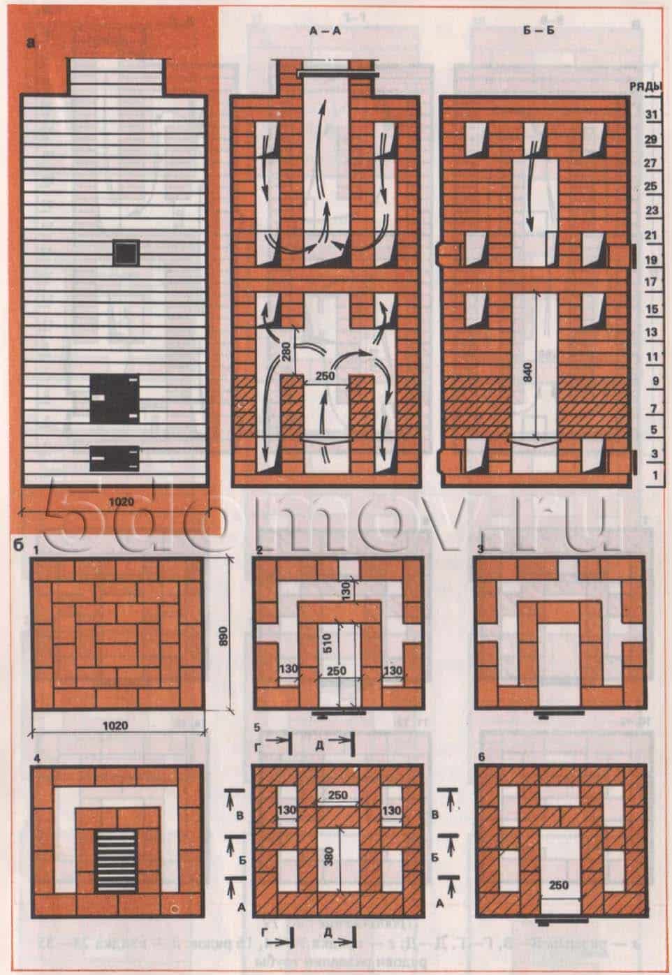 Рис. 4. Отопительная печь размером 890×1020 мм а — фасад и разрезы А—А, Б—Б; б — кладка 1 —6 рядов
