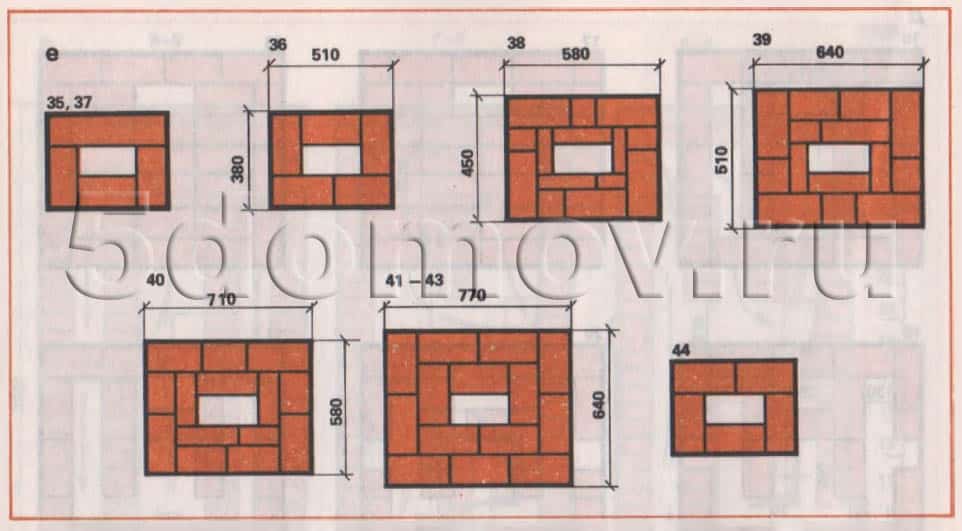 С тридцать шестого по сорок третий ряд показана кладка разделки трубы с внутренним сечением трубы 130×250 мм. Сорок второй и сорок третий ряды нужно выкладывать так же, как и сорок первый ряд, обязательно соблюдая при этом правила перевязки швов (порядовки 42 и 43 рядов не приведены). Кладка сорок третьего ряда похожа на кладку сорок первого ряда.