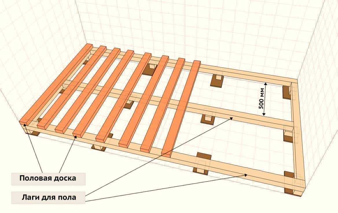 - Деревянный пол на лагах с утеплителем или без (детальнее: «Как сделать деревянный пол на балконе – инструкция по установке и обработке»).