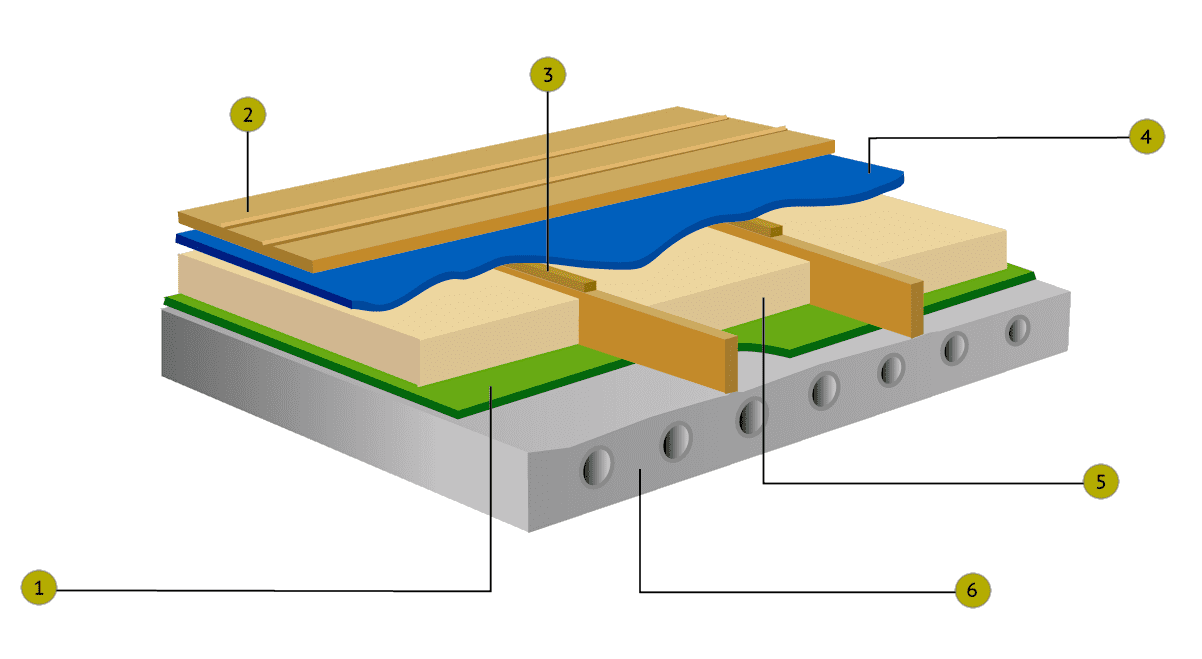 Схематическое устройство деревянного пола на балконе: 1 — пароизоляция, 2 — деревянная доска, 3 — контррейка, 4 — гидроизоляция, 5 — утеплитель, 6 — плита перекрытия