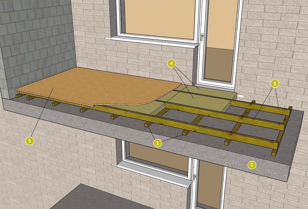 Наглядное руководство как сделать пол на балконе своими руками: 1 — бетонная плита, 2 — черновой контрбрус, 3 — лаги, 4 — утеплитель на основе базальтового волокна, 5 — фанера