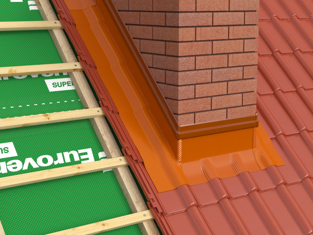 - Сверху кровли из профнастила, металлочерепицы и других материалов монтируют металлический верхний фартук, аналогичный нижнему. Можно использовать клеящиеся материалы, наподобие Вакафлекс, Мастер Флеш, Ондуфлеш и прочее.