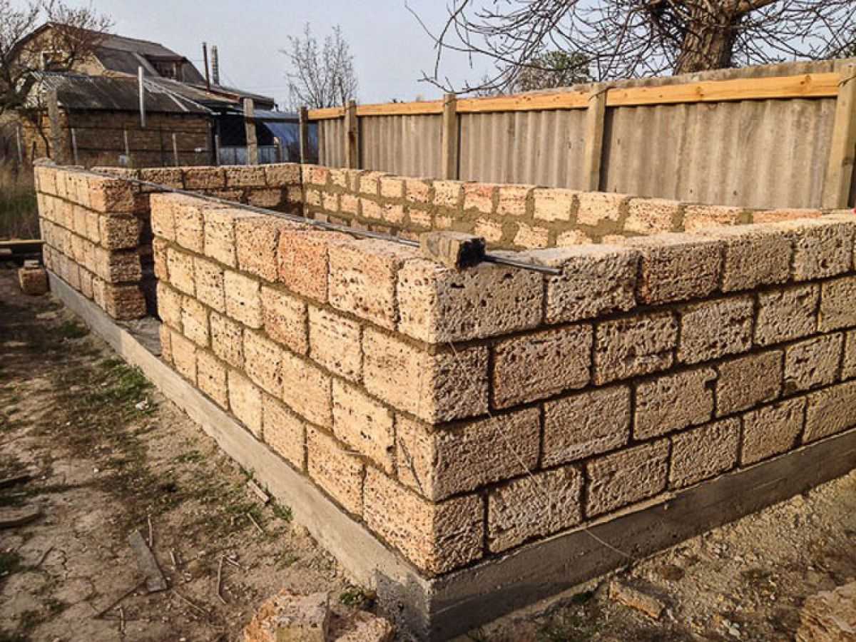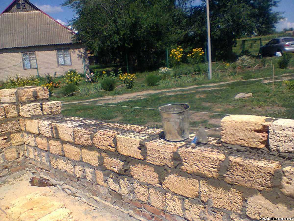 Отличие от технологии кладки из легкобетонных блоков, пожалуй, только одно – труднее вести стену из камня с разбросом по геометрическим размерам, а разброс доходит до 30 мм и выше. Кроме перерасхода раствора для швов, толщина которых требуется в 20-30 мм, чтобы выравнивать ряды, есть еще вопрос с самим раствором. Нужен раствор с очень хорошей пластичностью, но плотный, поэтому применяют пластификаторы в больших дозах. Кладка ведется как обычно – с углов по маячному шнуру и с выравниванием по горизонтали и вертикали. Толщина стен принимается в один или полтора камня. Стены толщиной в 580 мм не нуждаются в дополнительном слое утеплителя, их только оштукатуривают. Для внутренних ненесущих перегородок и стен хозпостроек достаточна кладка на ребро – толщиной 180 мм.