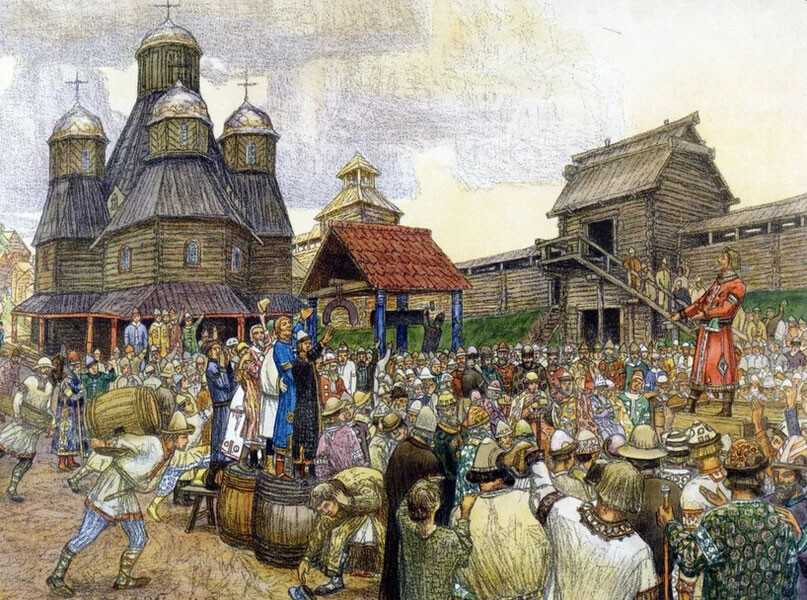 Вече – так в русских землях называлось народное собрание, которое созывалось для обсуждения насущных вопросов общественной жизни. Вече было органом прямой демократии. В нем принимали участие «мужи» – главы свободных семейств, вес голоса которых определялся их социальным статусом. От слова «вече» происходит слово «совет».