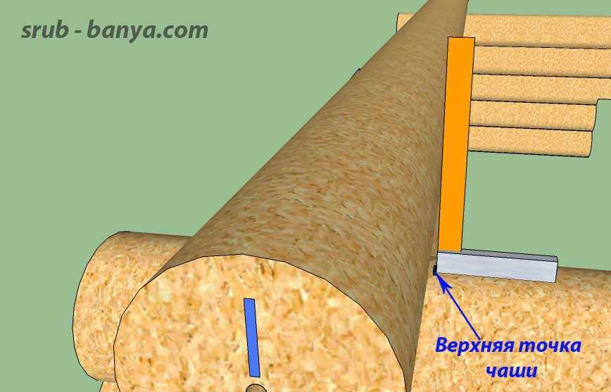 Исполнителю следует очень скрупулезно отметить полукруги на обоих бревнах одновременно, так как только совершенная точность расчетов и разметки обеспечивает максимальную плотность прилегания бревен друг к другу. Глубина выборки чаши при этом должна гарантировать такую посадку верхнего бревна в нижнем, чтобы верхний ствол выступал из нижнего на половину своего диаметра.
