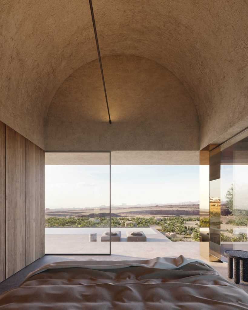 Для главного входа выбрана западная сторона, на восточной – обустроен бассейн прямоугольной формы, сливающийся с внешним двором. Для посадки растительности на крыше дома засыпана утрамбованная земля. Использованы различные виды грунта, отличающиеся текстурой и цветом. Послойная засыпка с последующим уплотнением позволила воспроизвести известные геологам вулканические породы, которые встречаются в пещерах.