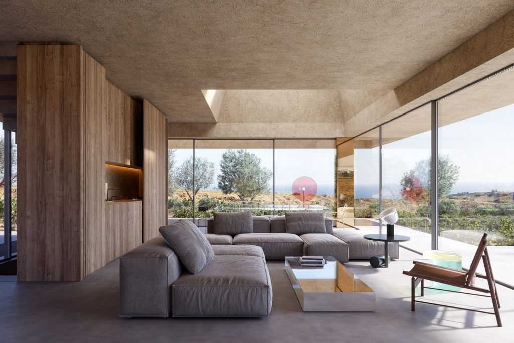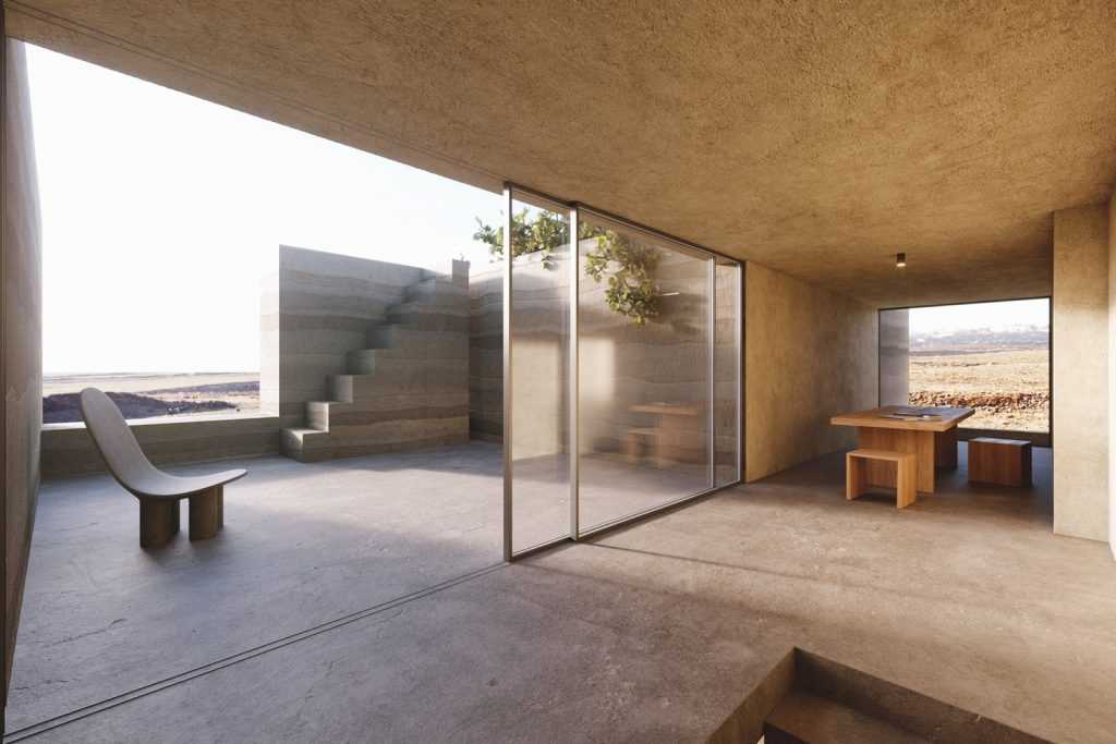 Внутренняя отделка жилых помещений гармонирует с земляными оттенками наружных стен. Полы залиты цементным раствором, как в промышленных предприятиях, а поверхности потолка и стен оштукатурены. Для отделки неподвижных перегородок использованы натуральные дубовые доски. Удачно подобрана мебель, являющаяся своеобразным продолжением философии материальности строения.