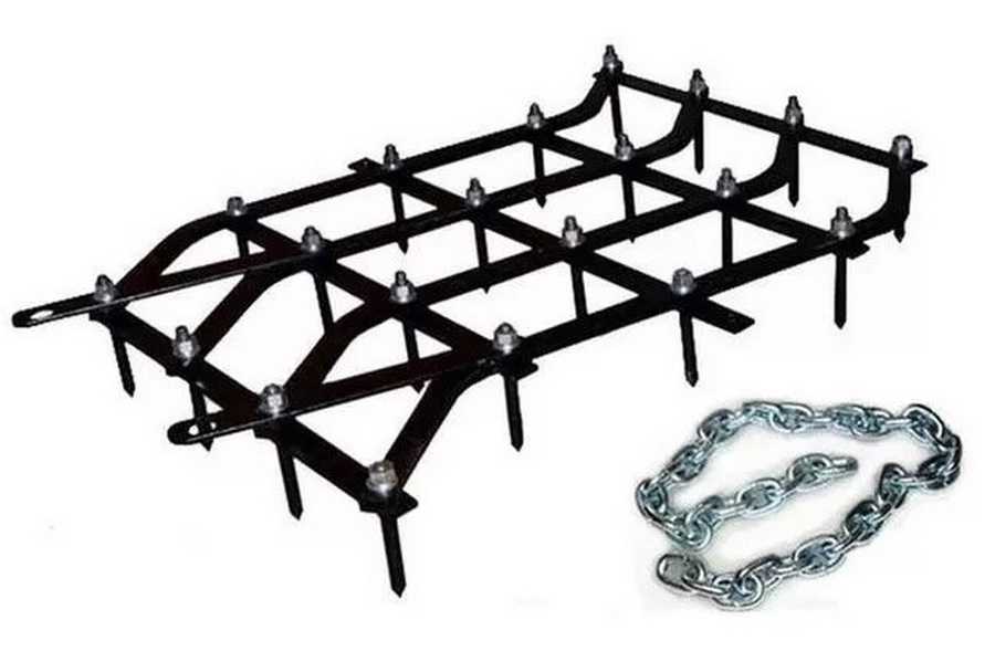 Борона представляет собой решетку, к которой жестко привариваются или крепятся болтами зубья. В передней части имеет прицепное приспособление – обычно это , которая вставляется в трубу фаркопа мотоблока и затем фиксируется при помощи пальца. Между ней и сцепкой необходимо вваривать цепь – без этого работа будет очень тяжелой для пахаря.