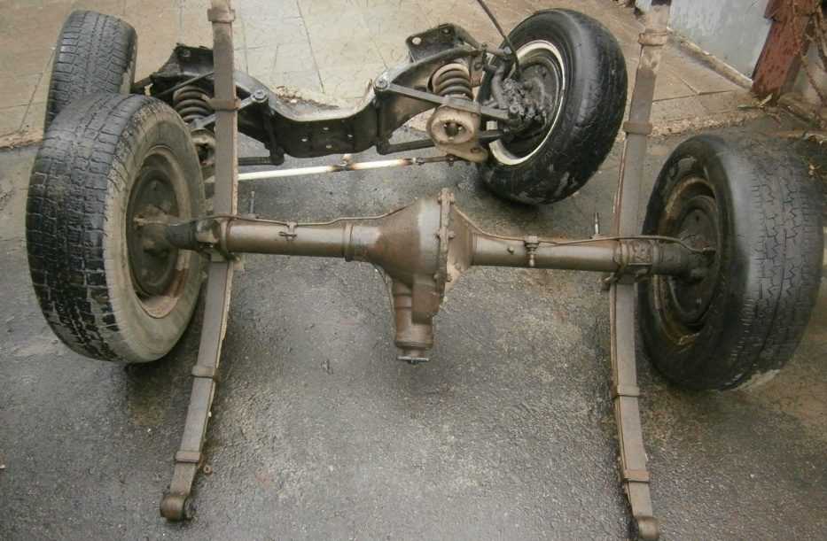 Рекомендуется взять исправный мост в комплекте от подходящей машины, например, от ГАЗ-21 «Волга». Для данных размеров его потребуется укоротить до 800 мм, обточив боковины, и снять заклепки на чулках фиксации.
