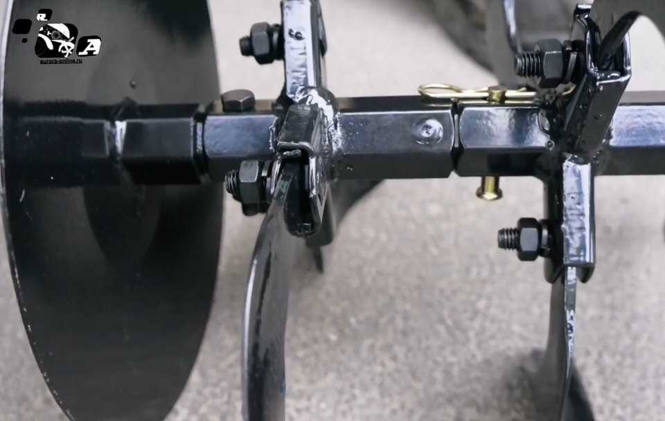 - На заднюю часть мотоблока необходимо установить сошник, играющий роль якоря и помогающий сделать культивацию более равномерной.