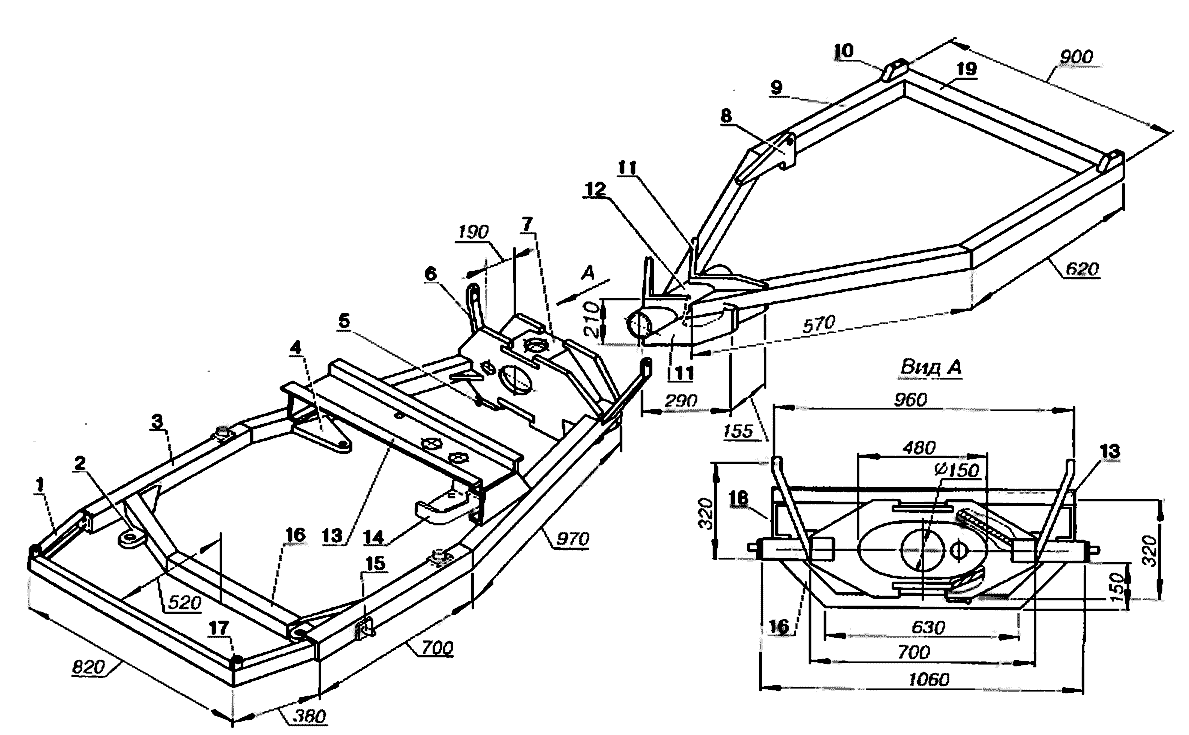 Для начала делают схематический чертёж, на котором прикидывают примерное расположение основных узлов. Затем изготавливают раму из швеллера и усиливают углы листовым металлом. Её ширину определяют по размеру имеющегося ведущего моста автомобиля. Длина рамы зависит от двигателя, который будет установлен, расположения руля, сиденья и навесного оборудования.