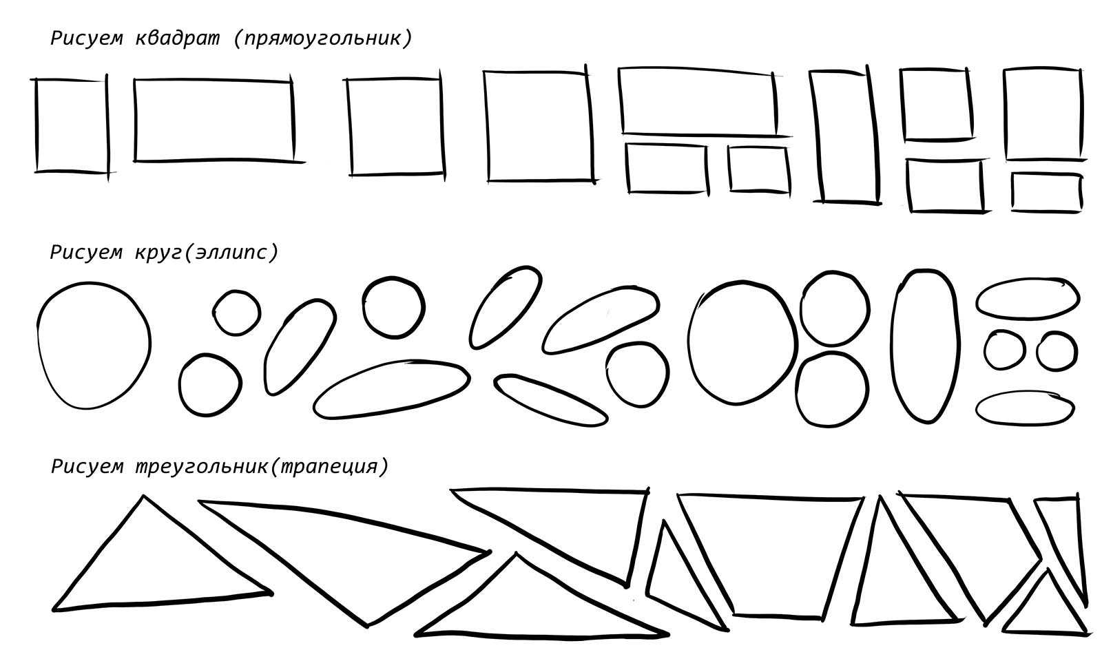Пришло время для задания посложнее — начать рисовать фигуры. Ведь все, что нас окружает, состоит из геометрических форм, поэтому в этом упражнении нужно будет практиковаться создавать их красивыми и ровными. Старайтесь рисовать фигуры разных размеров, с динамикой линий и без.