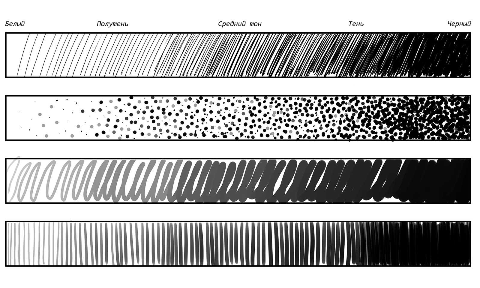 Суть упражнения заключается в том, чтобы создать градацию от белого цвета к черному, используя все возможности своего планшета и программы, в которой вы рисуете. Также вы можете нарисовать себе несколько квадратов и создать в каждом из них градацию с разным направлением и рисунком.