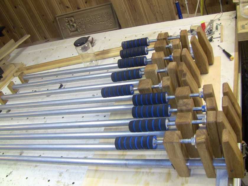 Проще всего сделать длинную струбцину по классической схеме. Стационарная, подвижная и переставная части изготавливаются из толстой фанеры.