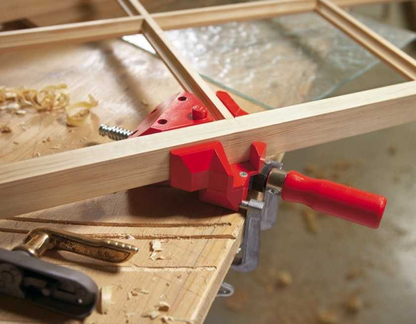Угловые струбцины: для быстрой и простой фиксации досок и рам под углом в 90 градусов используют угловые струбцины. По мимо угловых с их помощью можно выполнять и Т-образные соединения.