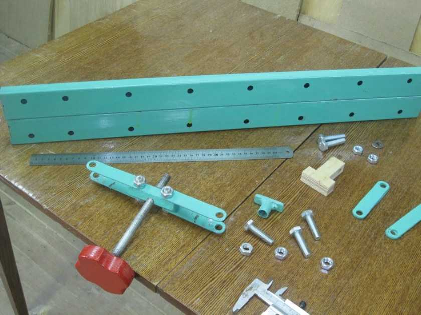 Каждая деталь состоит из двух половинок, которые вырезаются лобзиком и стягиваются болтами на длинной квадратной трубе. Ходовой винт можно сделать из двух частей резьбовой шпильки и обычного куска арматуры.