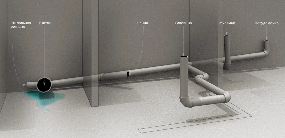 Система должна располагаться с уклоном к канализационному стояку или точке общего водосбора