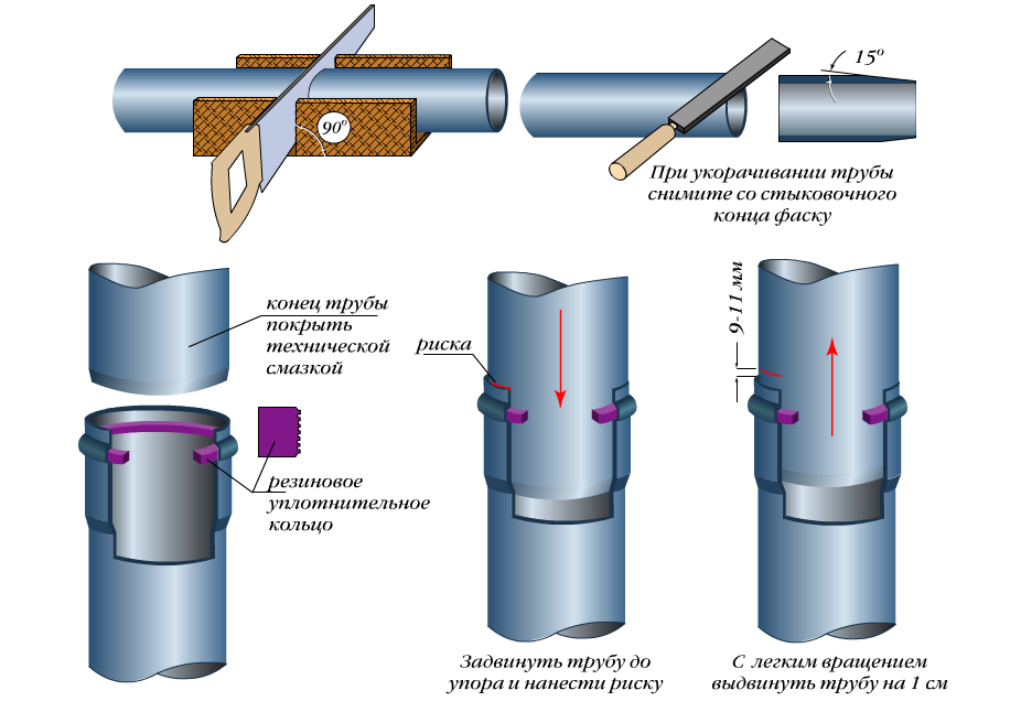 Перед стыковкой нужно убедиться, что торец без раструба перпендикулярен оси, иначе при эксплуатации возможно изгибание трубопровода. С кромки напильником снимают фаску, чтобы не повредить уплотнительное кольцо из резины в раструбе. Его очищают от грязи и пыли. Чтобы добиться повышения герметизации подготовленный конец трубы смазывается силиконовой смазкой, затем до упора вставляется в раструб. На месте где остановился его край, ставится отметка и сдвигается назад на 1 см. Получившийся зазор необходим для компенсации линейного расширения, возникающего при нагреве.