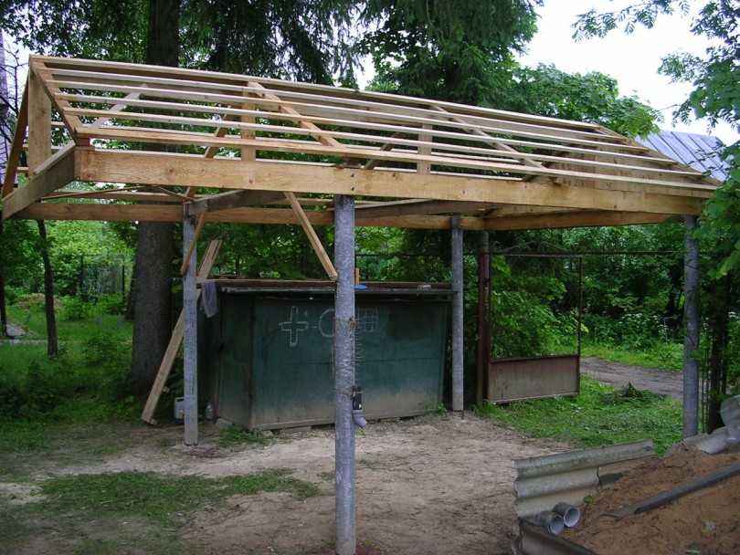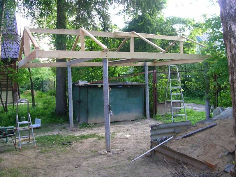 Единственным недостатком такой конструкции является сложность в обработке, так как для некоторых процессов может потребоваться сварочный аппарат или электродрель. Для возведения опор будущего каркаса часто используют асбестоцементные трубы, заполненные бетоном. Они отличатся высокой прочностью и быстрыми сроками возведения. Что касается кровли навеса, то в основном отдают предпочтение листам профнастила.