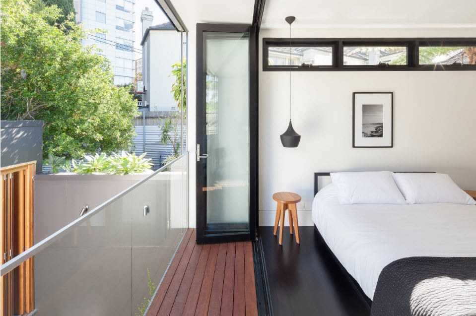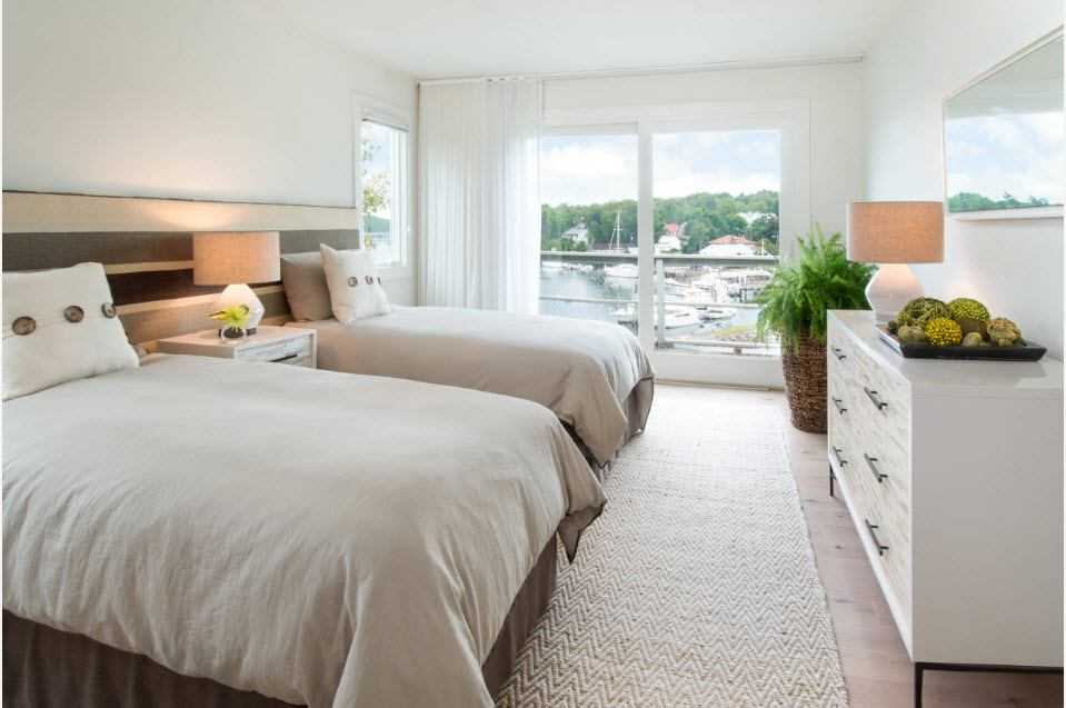 За счет игры тонов комната кажется более просторной ― дизайн узкой длинной спальни, фото