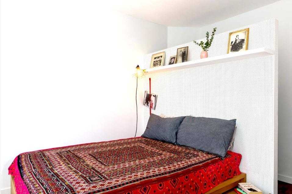 Чтобы сэкономить место прикроватные тумбочки можно заменить полкой, расположенной над изголовьем кровати или между кроватью и стеной.