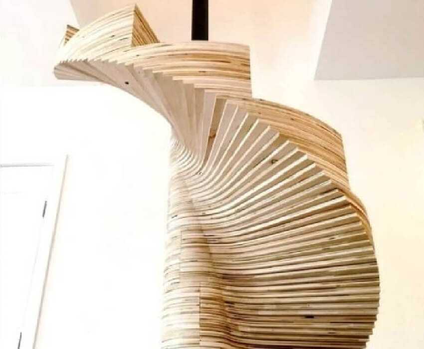 Нередко, сооружают винтовые лестницы своими руками, из фанеры. Этот, доступный каждому домовладельцу, стройматериал, который используют как для отдельных элементов, так и для всей, лестничной конструкции, в целом.