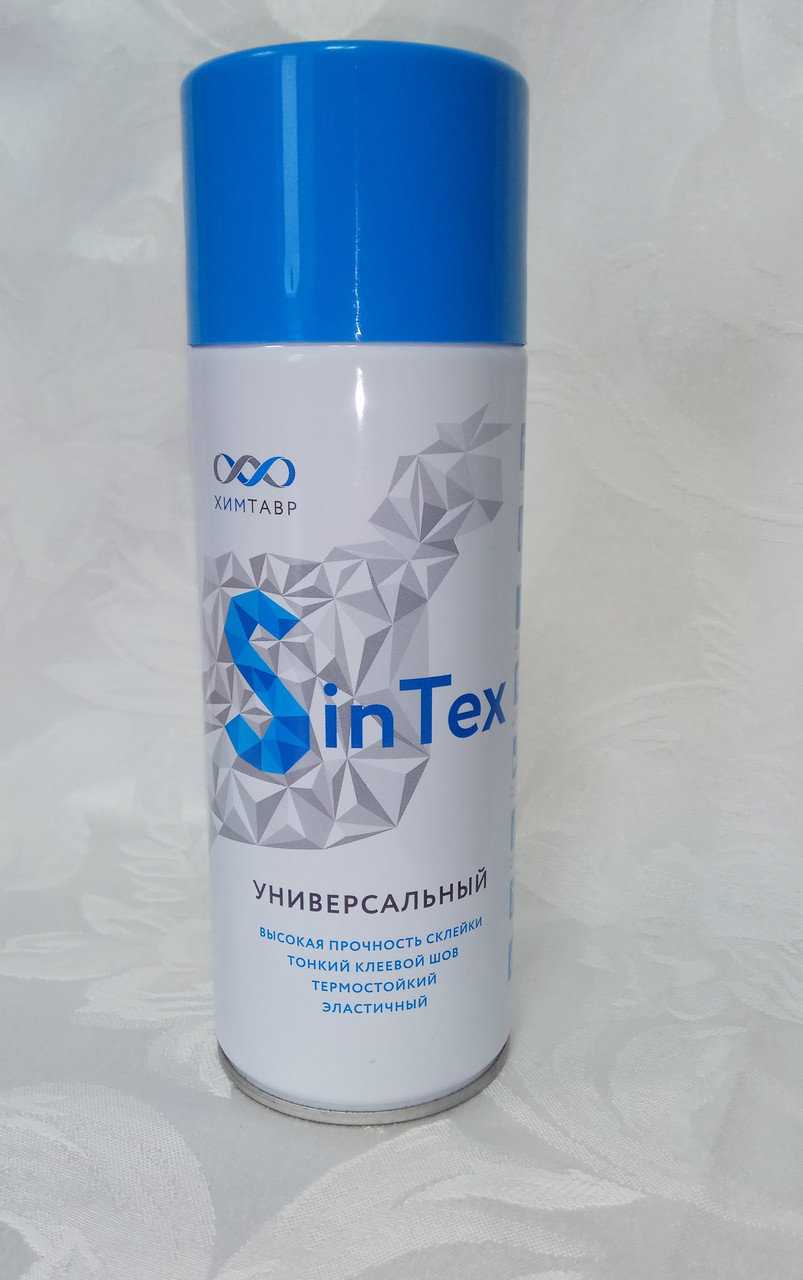 Клей Sintex выпускается в форме банок, тубусов, но удобнее всего использовать аэрозоль в баллончике. Основа – каучук. Негорючее средство используется при производстве матрасов и мебели. При поклейке Синтексом образуется тонкий прочный и очень эластичный шов.