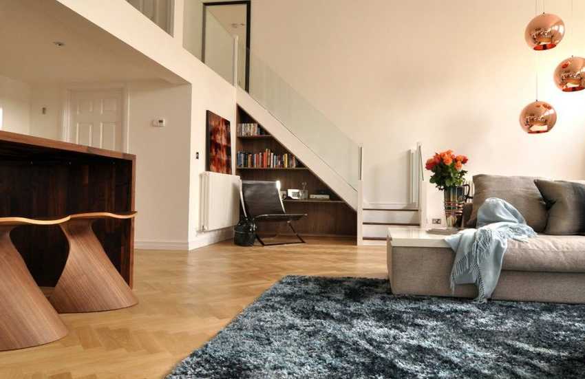 Расположение лестницы определило ее форму — в виде буквы Г. Такой вариант подходил функционально и эстетически. Делать ее прямой вдоль одной стены не позволяло место. Хотелось более компактную конструкцию, которая будет зонировать пространство.