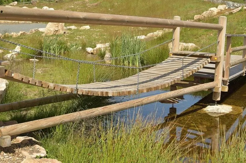 Если грунт на берегах ручья каменистый, то можно построить мост подвесной системы. Он проще и удобнее в строительстве, потребуется лишь вкопать четыре вертикальные опоры из бревен или стальной трубы. Остальные части изготавливаются из реек, дощечек и толстого полипропиленового каната. Такой мостик можно разворачивать на летний сезон и убирать в помещение дачи поздней осенью по окончании работ в саду.
