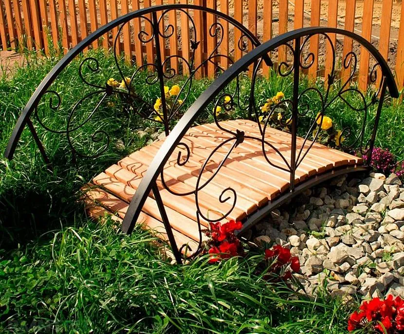 Металлические декоративные мостики более долговечный и привлекательный вариант, хотя и более дорогой. Конечно, в японском стиле для устройства мостиков больше используют дерево и камень. А вот в любой другой стиль, железный мостик с художественной ковкой впишется прекрасно.