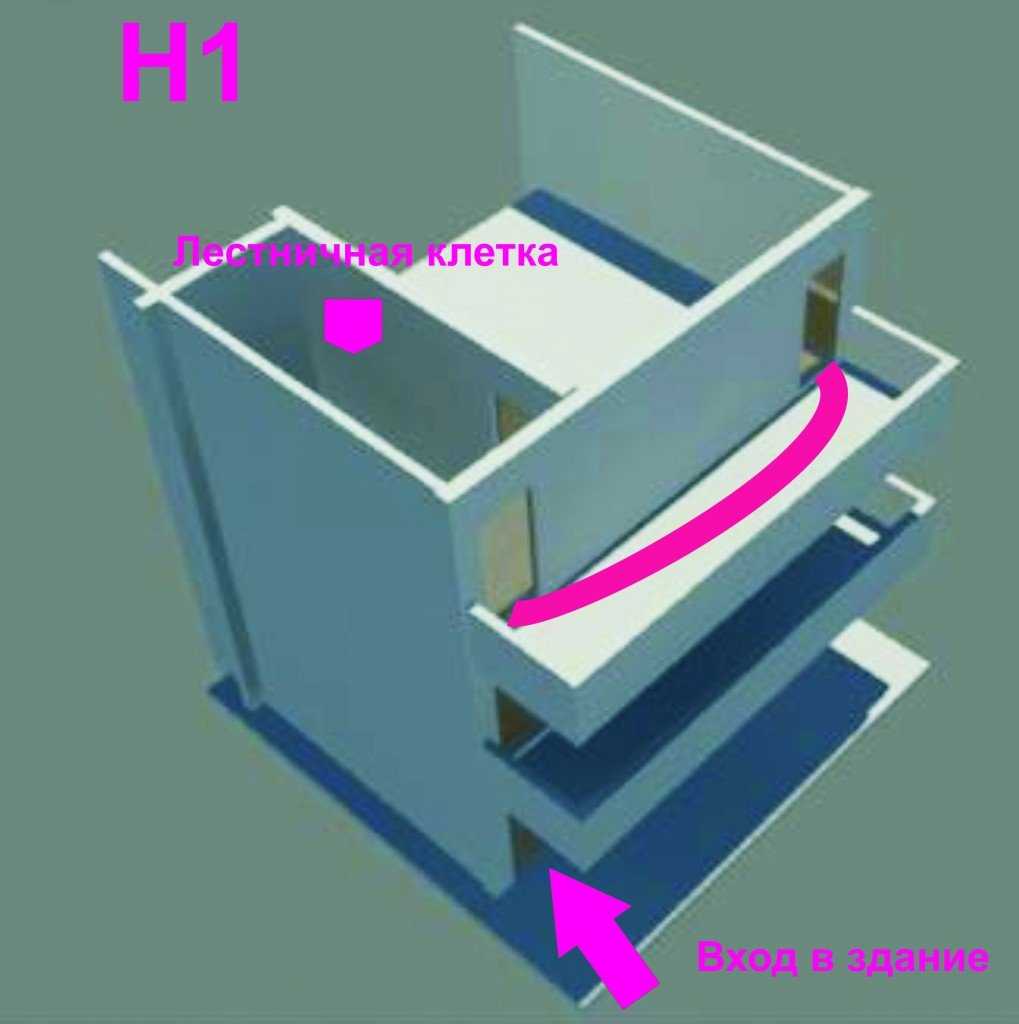 Лучшим вариантом для расположения лестниц Н1 является угловая часть многоэтажки. Это трактуется необходимостью изолированного выхода от задымляемости. Кроме того, дверь, которая ведет на открытую площадку, должна быть изготовлена из противопожарного материала.